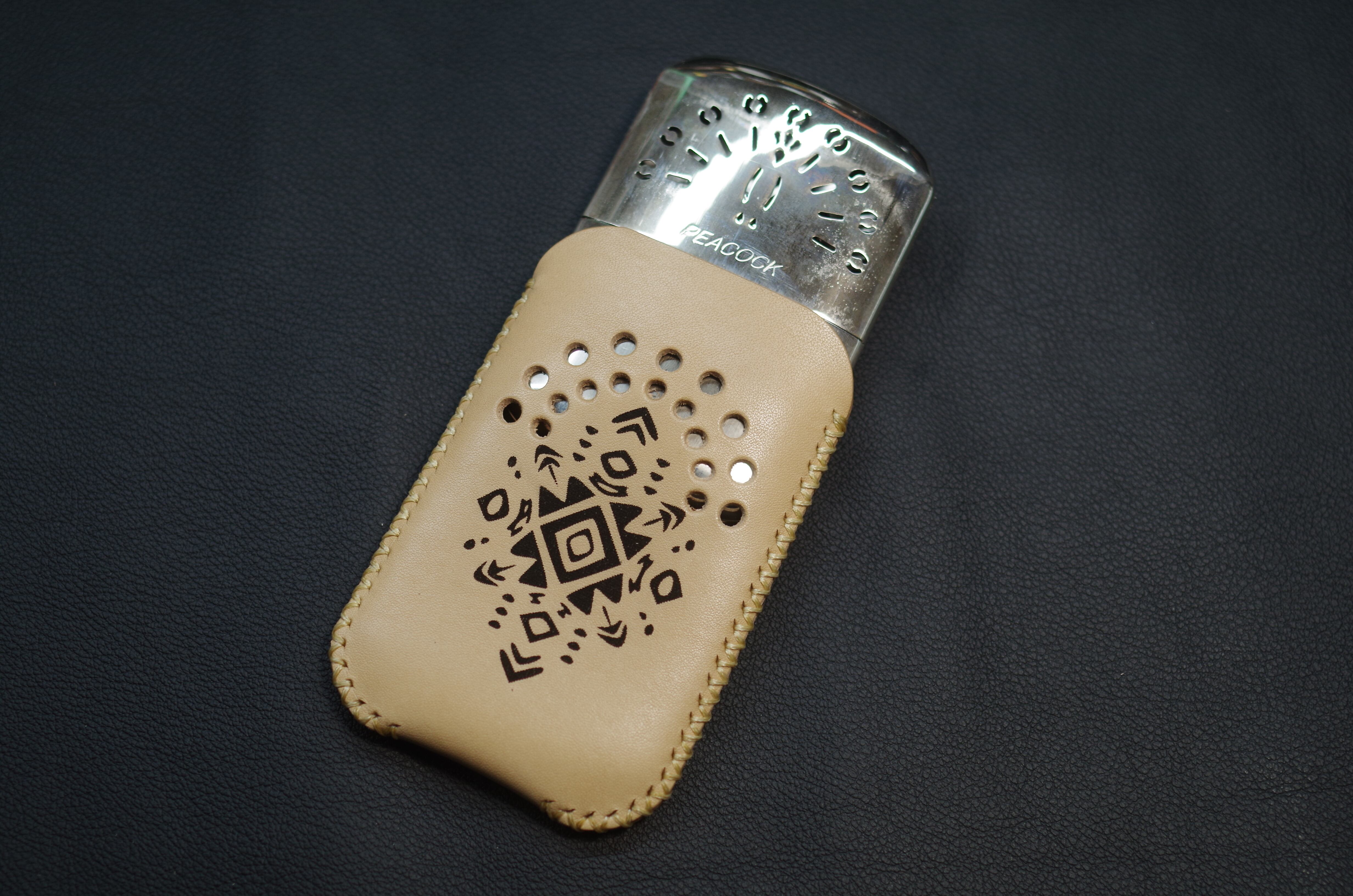レーザー加工機でオルテガ柄の焼印を施したハクキンカイロレザーケースです。
