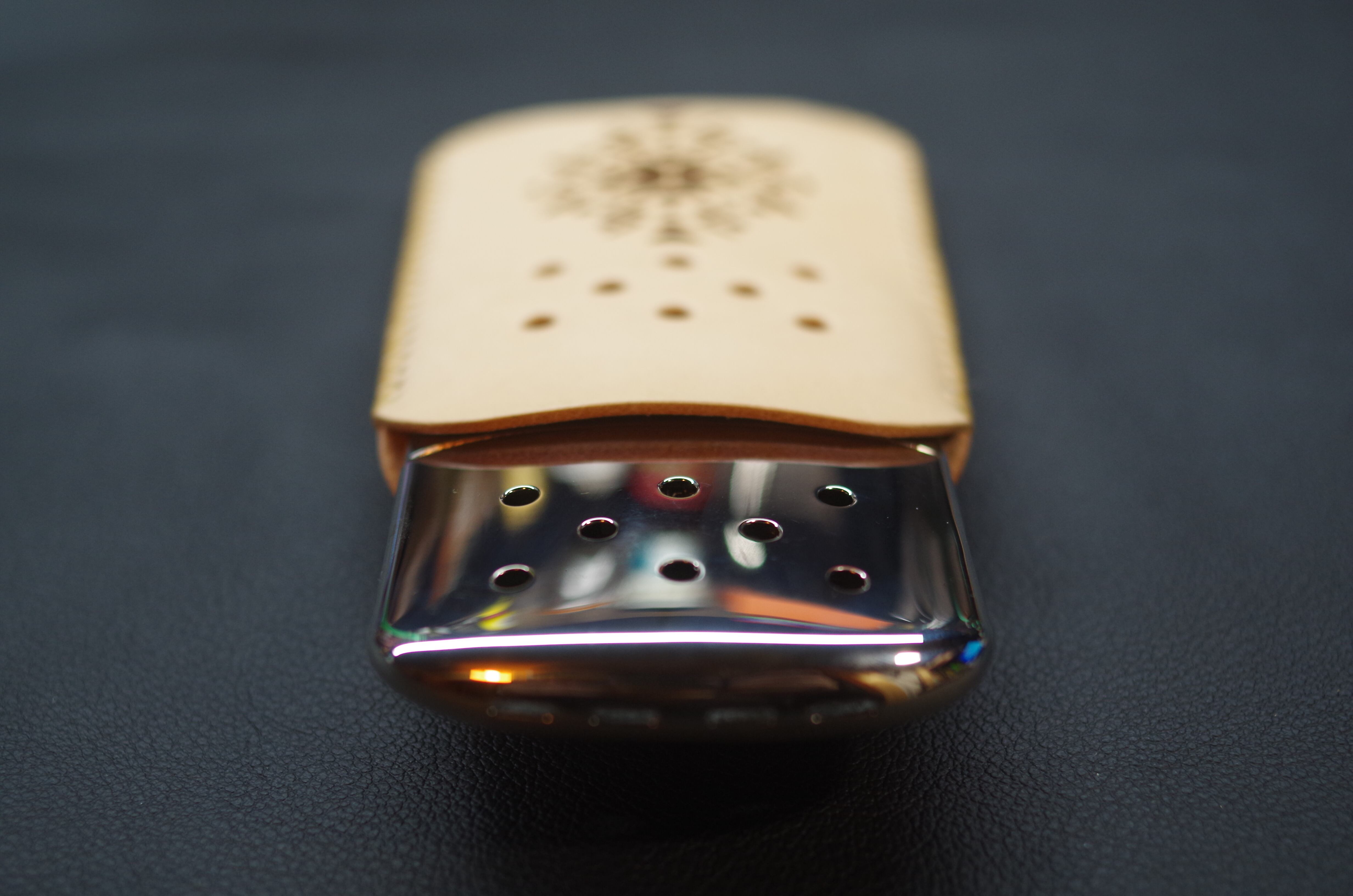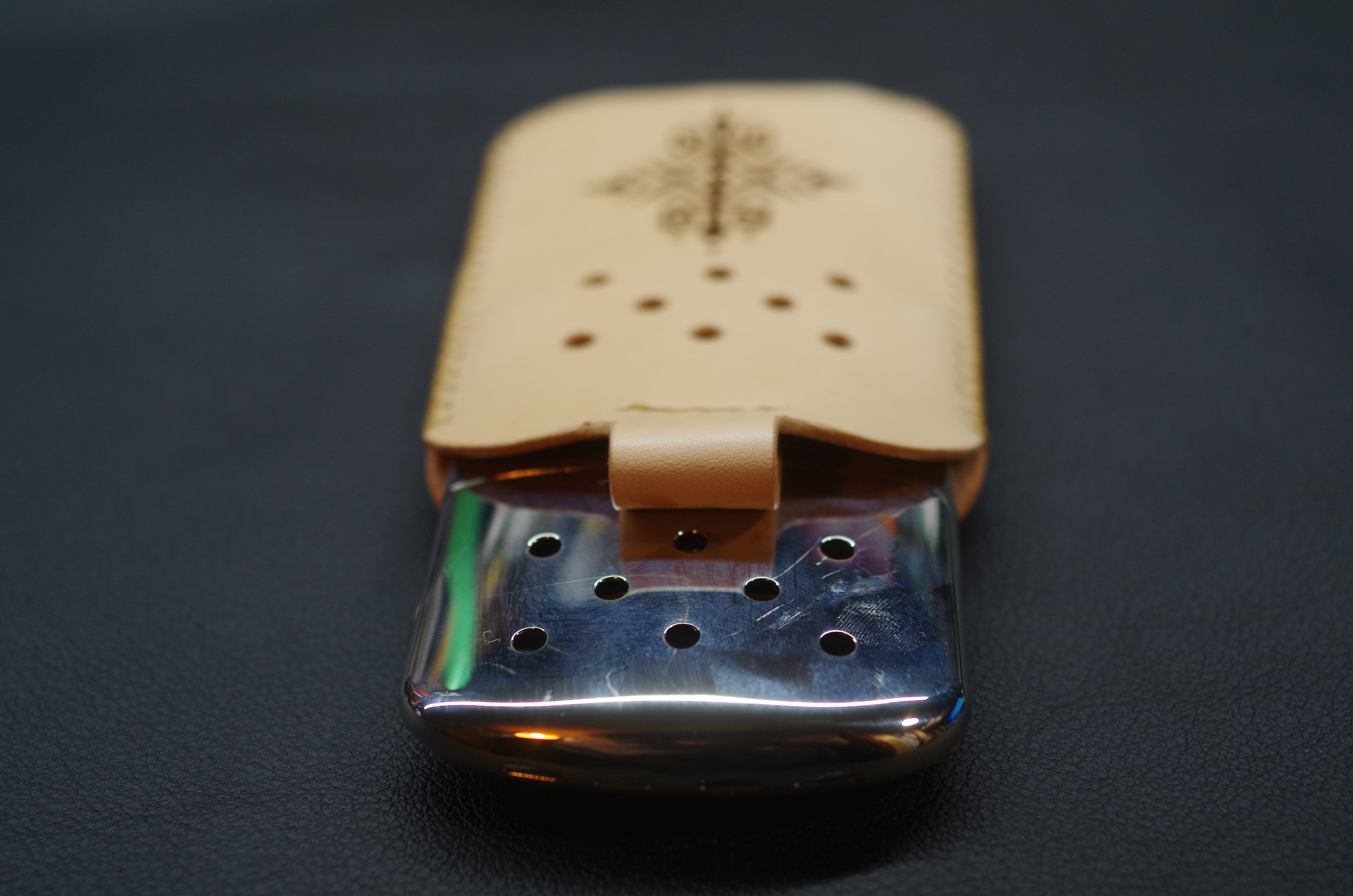 寸法ぴったりのパッツパツに製作することでケースと革の隙間を無くし熱を外にしっかりと伝える設計です。耐熱性の高い革を使用することでちょうどいい温度を実現しました。ケースから本体を取り出すときは下の部分を両手でつまむとヌルっと出てきます!